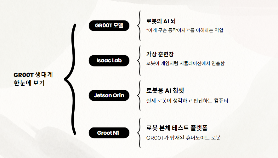 GR00T는 일종의 **"로봇 두뇌 소프트웨어"**입니다. 기존 로봇이 정해진 명령만 수행했다면, GR00T는 사람처럼 상황을 보고 판단하고 학습할 수 있습니다.